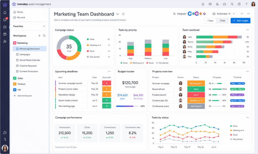 monday.com offers over 27 task views to visualize task progress, including charts, Gantt charts, Calendars, Workloads, Timelines, Kanban boards, Tables, Forms, Cards, Files, and Blank views. That’s not just variety for the sake of it — different teams genuinely think differently, and having your visual thinker and your spreadsheet nerd both happy on the same platform? Priceless.